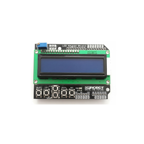 Designed for Arduino-compatible boards, the LCD Keypad Shield provides a user-friendly interface for menu navigation, selections, and basic control systems. It includes a 1602 LCD with white characters and a blue backlight. The keypad features five buttons: Select, Up, Right, Down, and Left. To conserve digital I/O pins, all buttons are read through a single ADC channel using a five-level voltage divider.