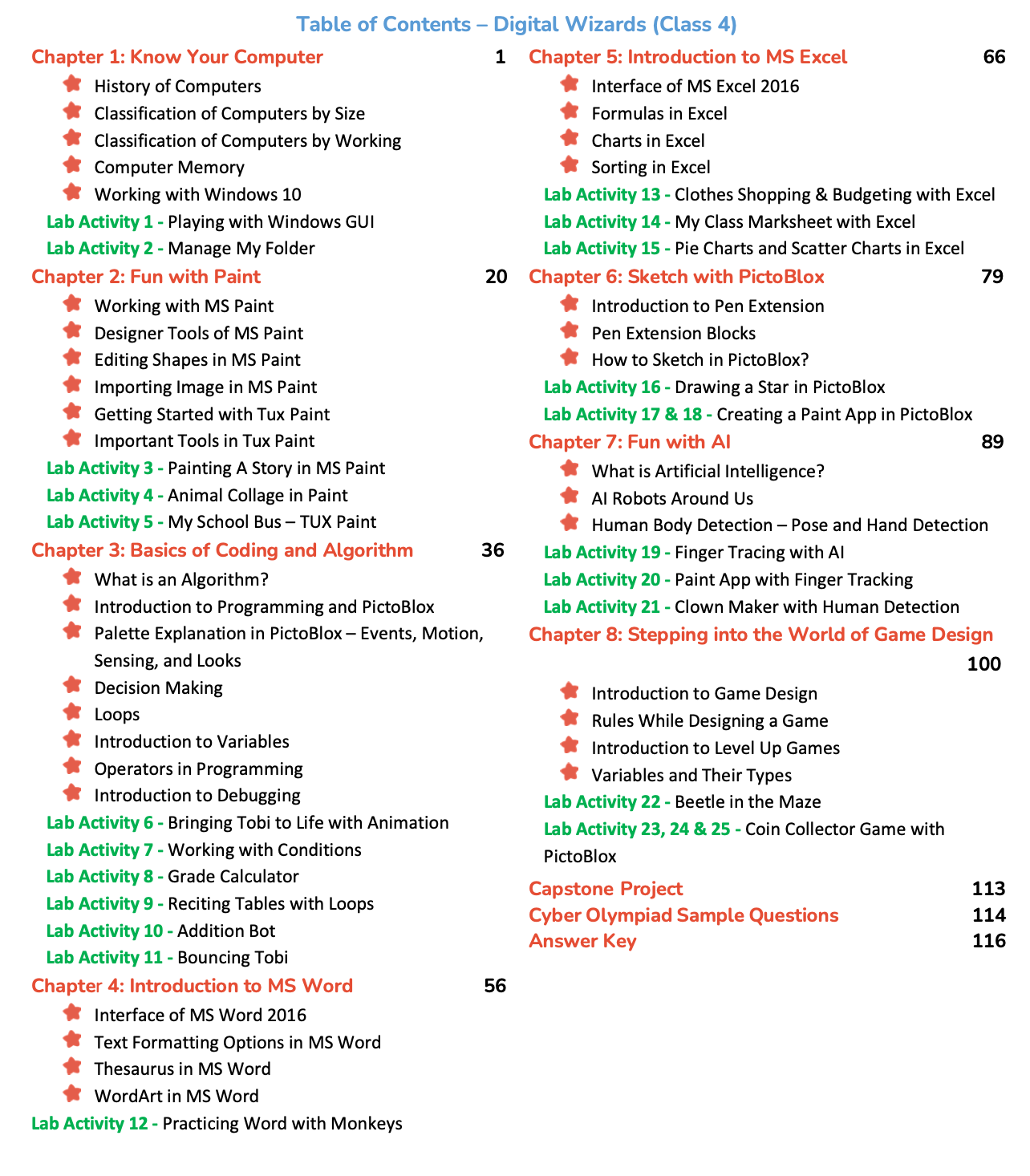A major highlight of Digital Wizards – Class 4 is the Capstone Project, where learners apply their cumulative knowledge to design a comprehensive project that reflects their skills in coding, creativity, logic, and AI. The course also includes Cyber Olympiad sample questions to reinforce learning outcomes and boost exam readiness.