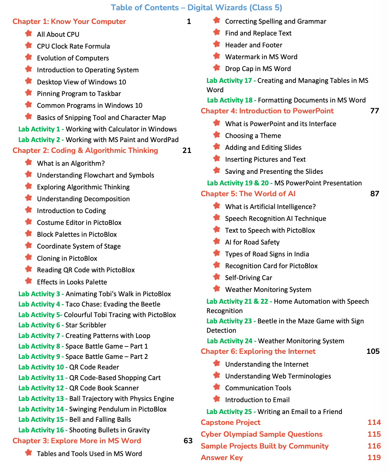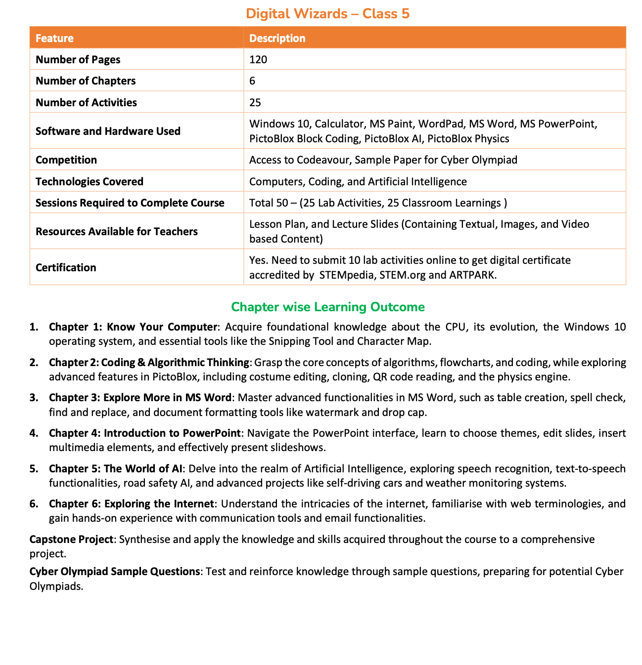 A key highlight of Digital Wizards – Class 5 is the Capstone Project, where learners integrate their knowledge across computing, coding, AI, and productivity tools to build a comprehensive, real-world project. The course also includes Cyber Olympiad sample questions and community-built sample projects to reinforce learning and inspire innovation.