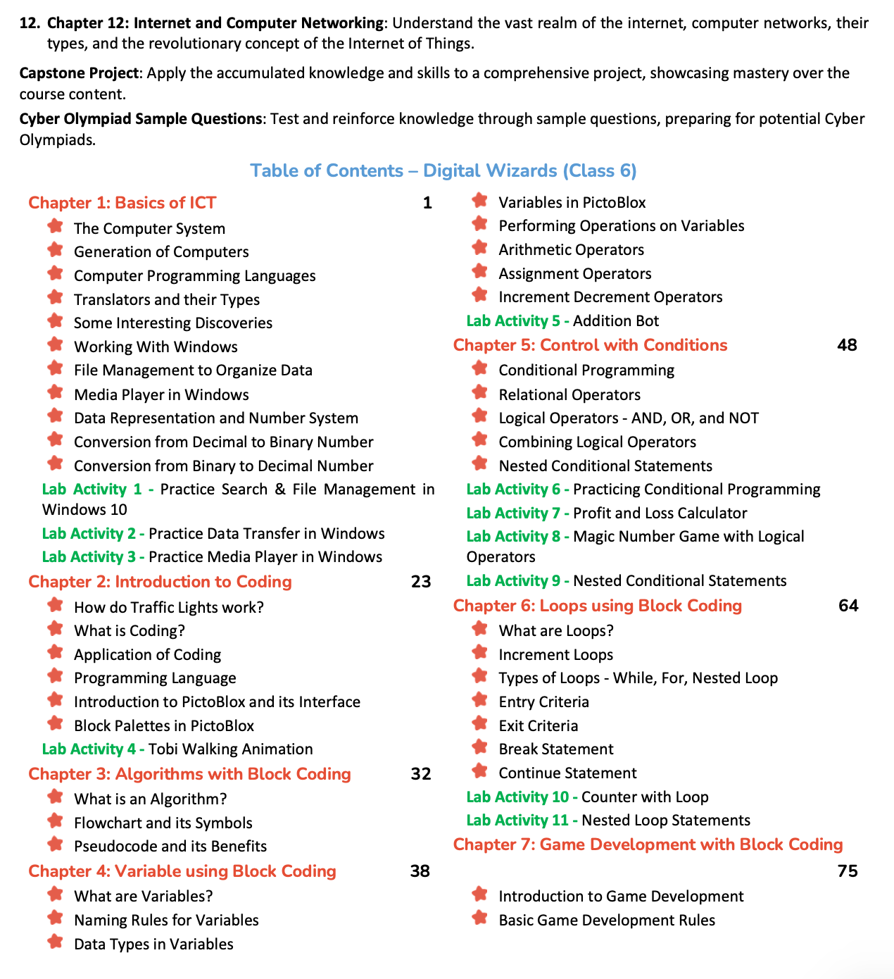 A key highlight of Digital Wizards – Class 6 is the Capstone Project, where learners apply their accumulated knowledge across coding, AI, productivity tools, and networking to build a comprehensive, real-world project. The course also includes Cyber Olympiad sample questions to reinforce learning outcomes and prepare students for future competitive examinations.