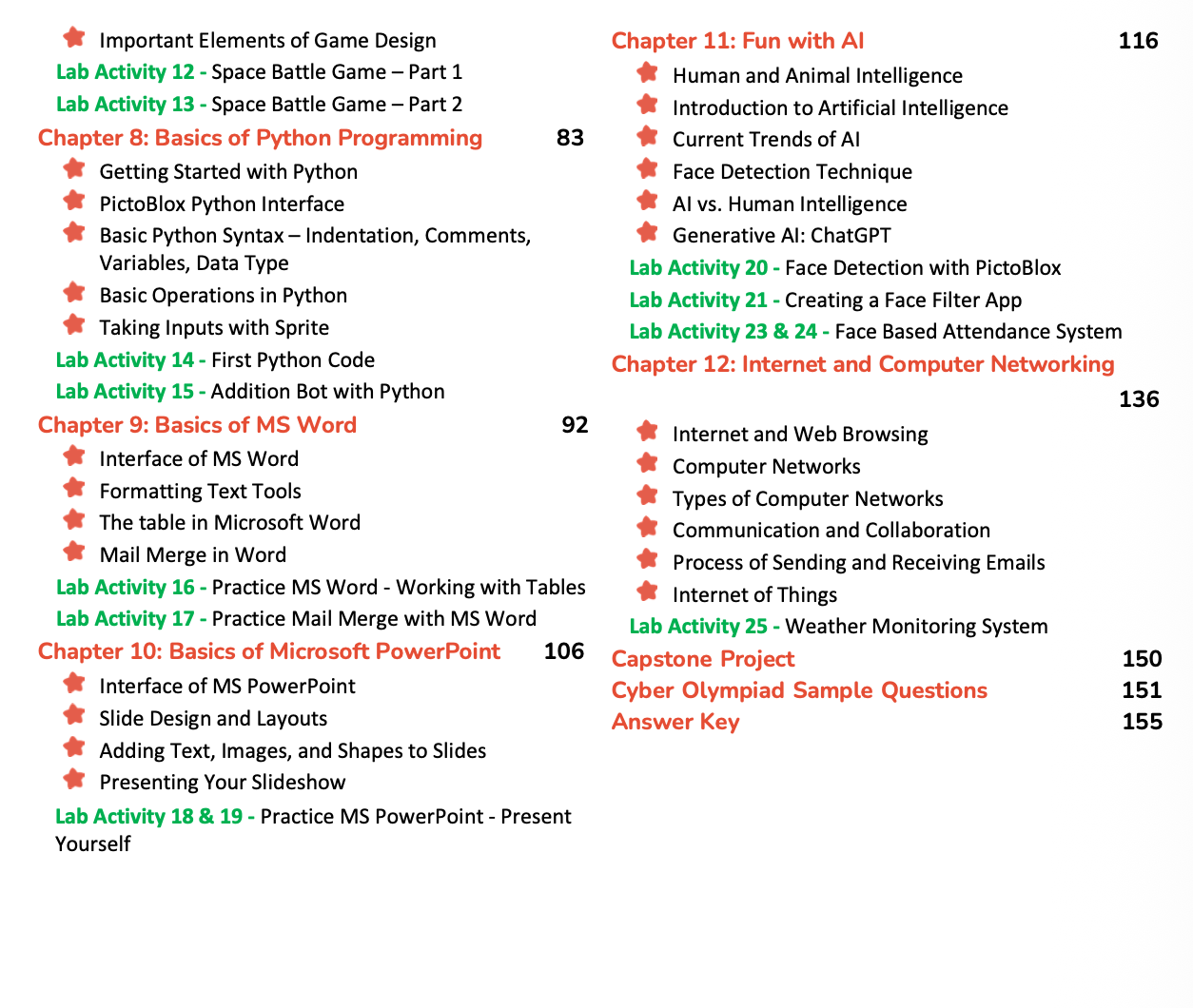 Aligned with the CBSE Class 6 Coding Skill Subject (Chapters 2–7), students explore core coding concepts using PictoBlox Block Coding and PictoBlox AI, alongside tools such as Windows 10, Windows Media Player, MS Word, and MS PowerPoint. The curriculum covers ICT fundamentals, algorithms, variables, conditions, loops, game development, introductory Python programming, document creation, presentation skills, artificial intelligence, and computer networking, providing a well-rounded digital education. Learners also gain access to the Codeavour competition and Cyber Olympiad sample papers, supporting competitive exposure and assessment readiness.