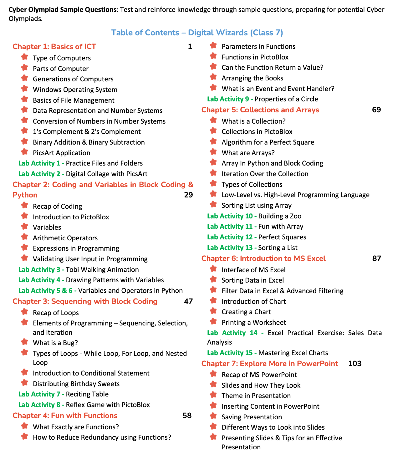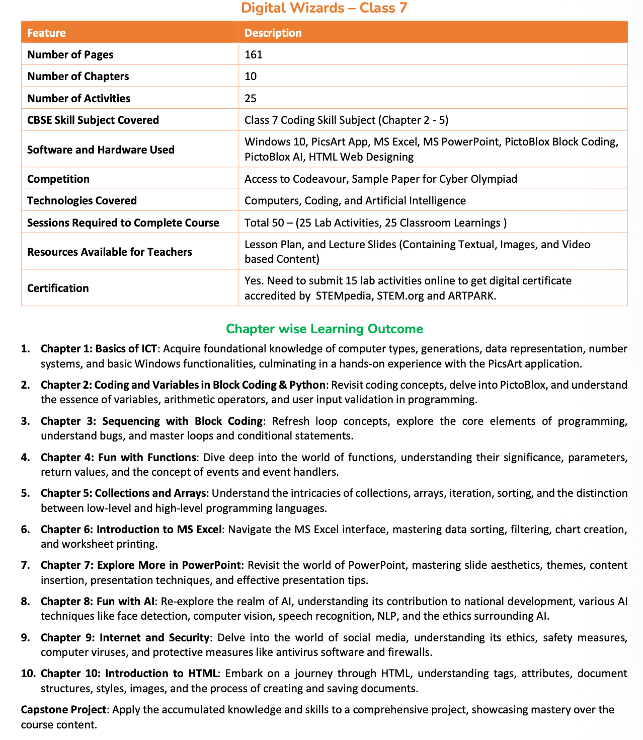 Aligned with the CBSE Class 7 Coding Skill Subject (Chapters 2–5), students explore both block-based and text-based programming using PictoBlox Block Coding, PictoBlox AI, and Python concepts, while also working with tools such as Windows 10, PicsArt, MS Excel, MS PowerPoint, and HTML for web designing. The curriculum covers ICT fundamentals, variables, loops, functions, arrays, data analysis, presentation skills, artificial intelligence techniques, internet safety, and basic web development, preparing learners for modern digital challenges. Students also receive access to the Codeavour competition and Cyber Olympiad sample papers, supporting competitive exposure and assessment readiness.