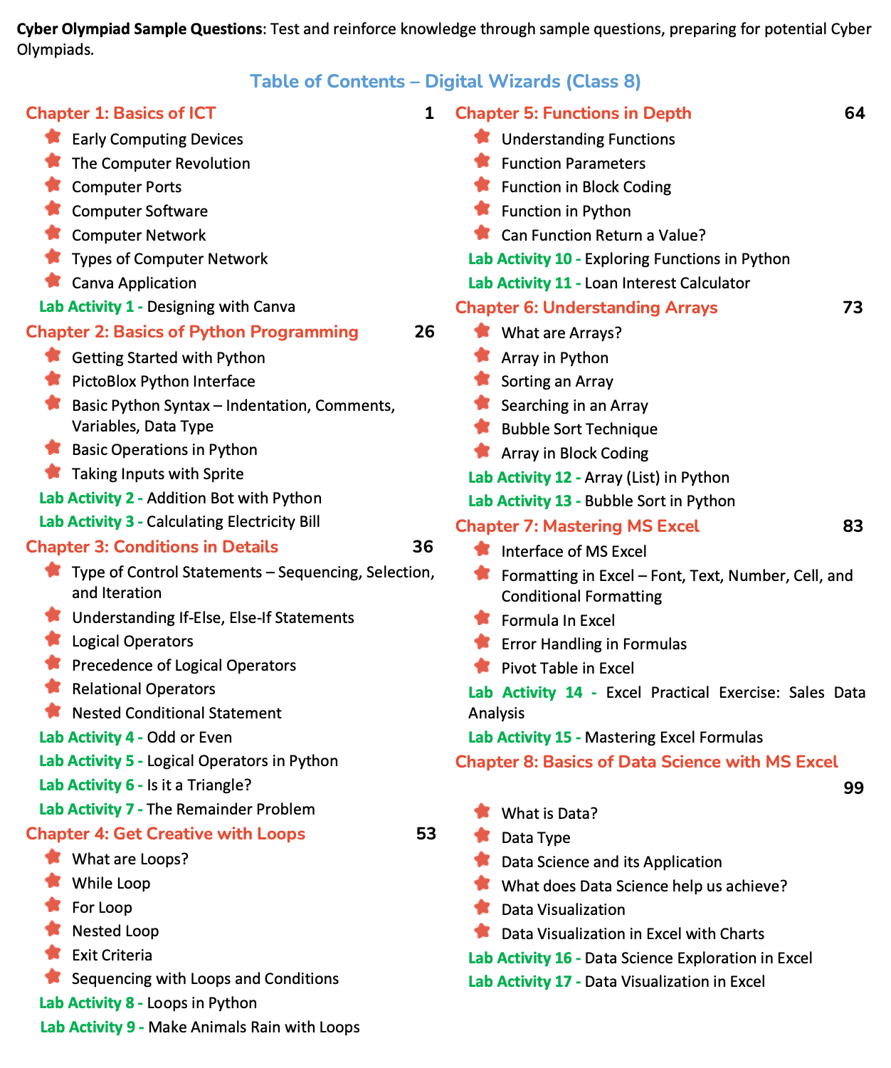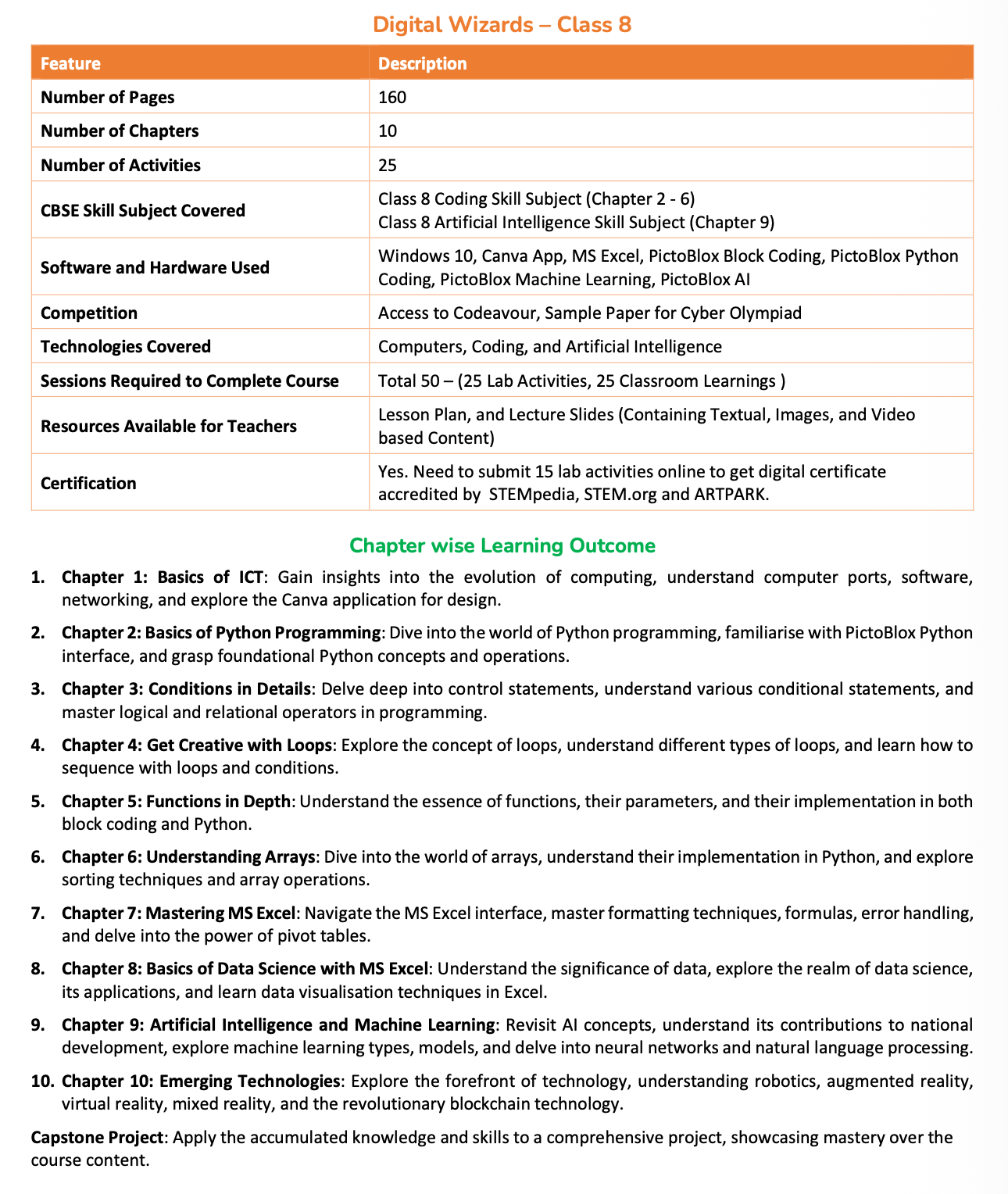 A key highlight of Digital Wizards – Class 8 is the Capstone Project, where learners integrate their knowledge of coding, data science, AI, and emerging technologies to build a comprehensive, real-world project demonstrating innovation and problem-solving skills. The course also includes Cyber Olympiad sample questions to reinforce learning and prepare students for competitive examinations.