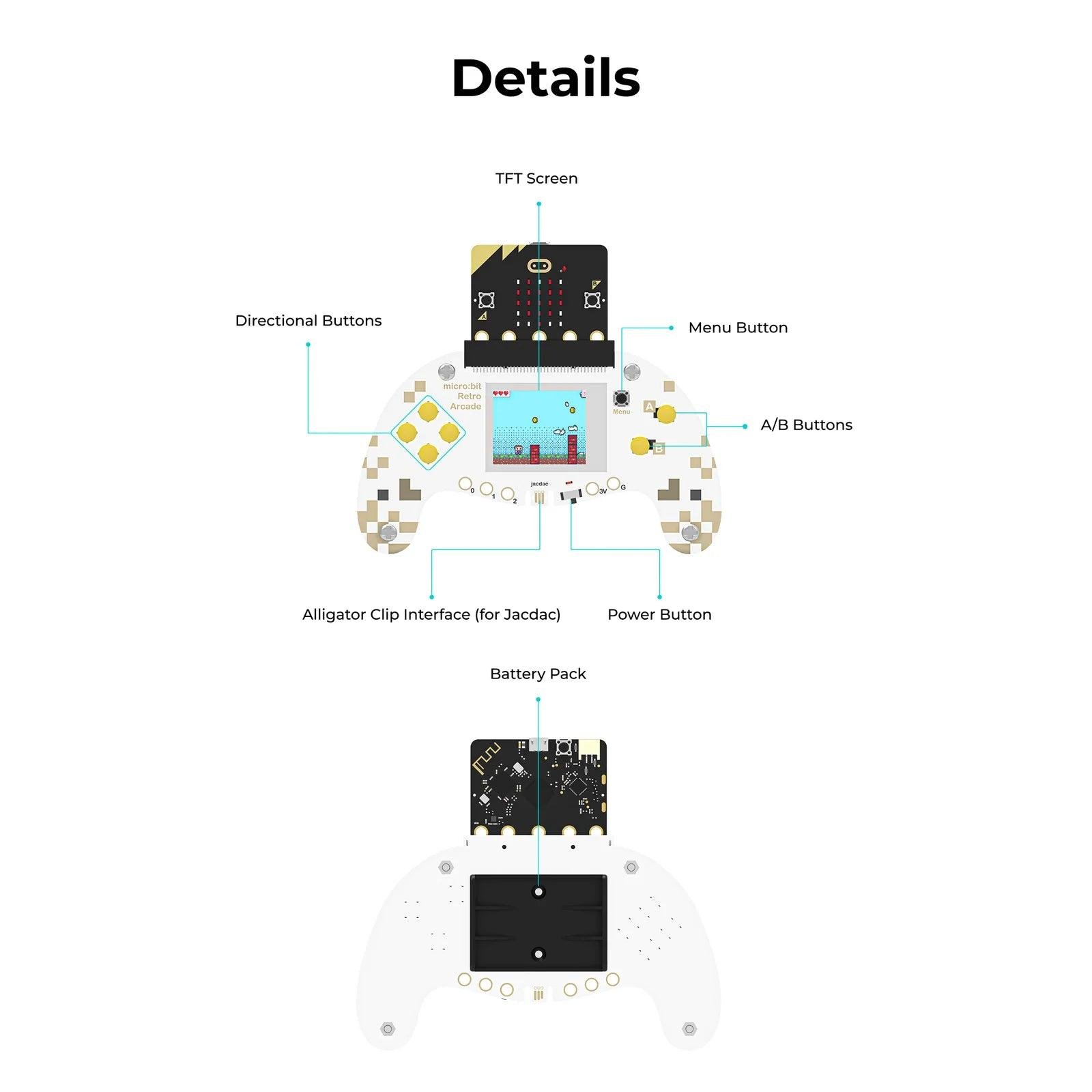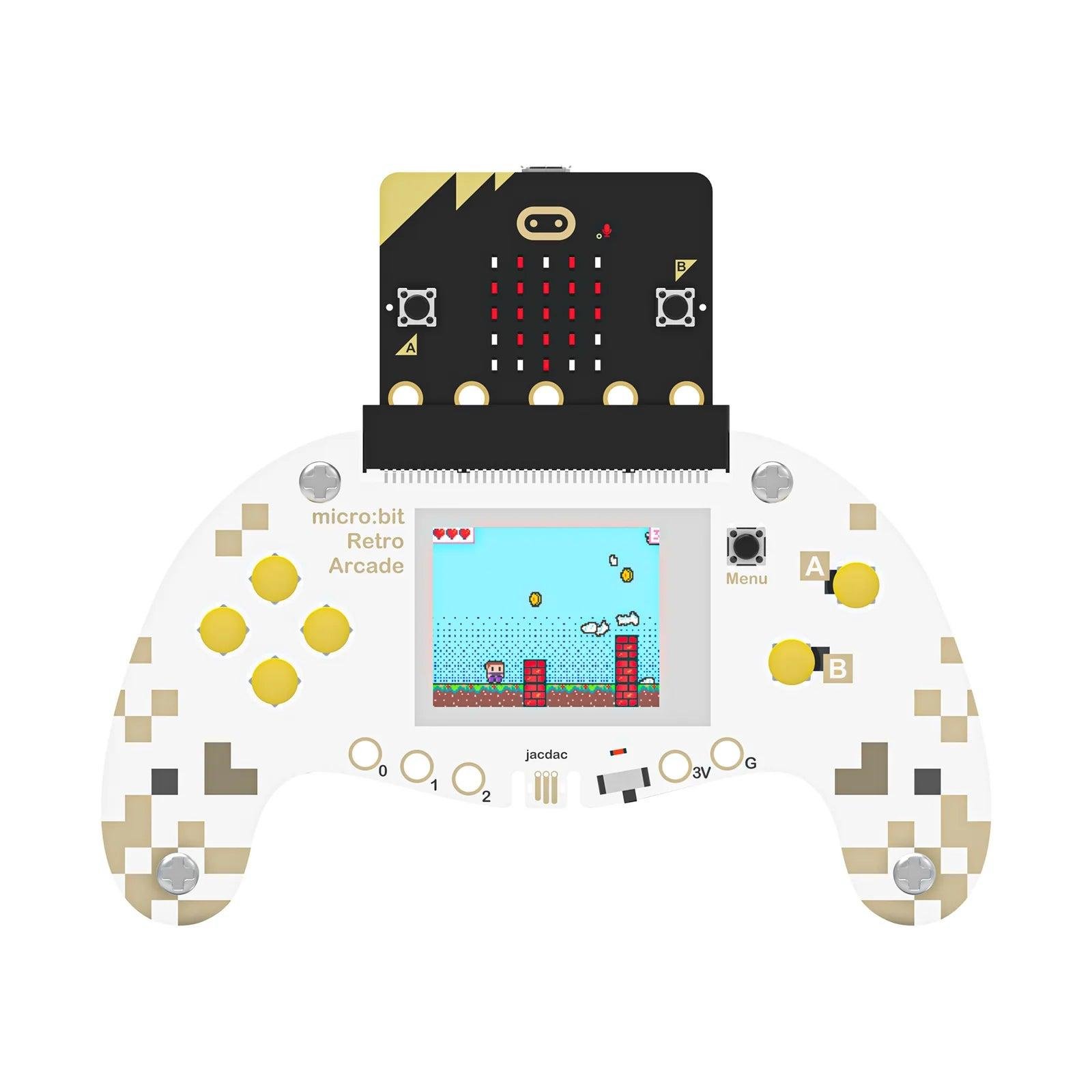 The micro:bit Retro Arcade expansion board brings a vivid, joystick-style interface to your micro:bit V2. Equipped with a full-color 160 _ 128 TFT screen, four directional buttons, two A/B buttons, and a reset button, it both a playful handheld gaming device and a functional remote control. Use it to program and play your own games within the Microsoft Arcade ecosystemr control robots and smart cars for interactive projects.