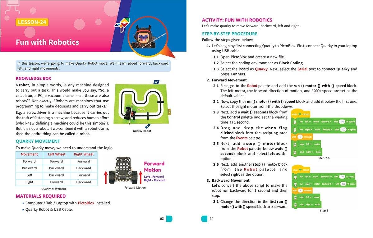 Designed especially for young minds, this Class 3 CBSE-aligned textbook offers an exciting introduction to Coding, Artificial Intelligence, and Robotics through 30 hands-on, activity-based lessons. Using interactive tools like PictoBloxand the Quarky Robot, students build critical thinking, creativity, and problem-solving skillsaking learning both fun and future-focused.