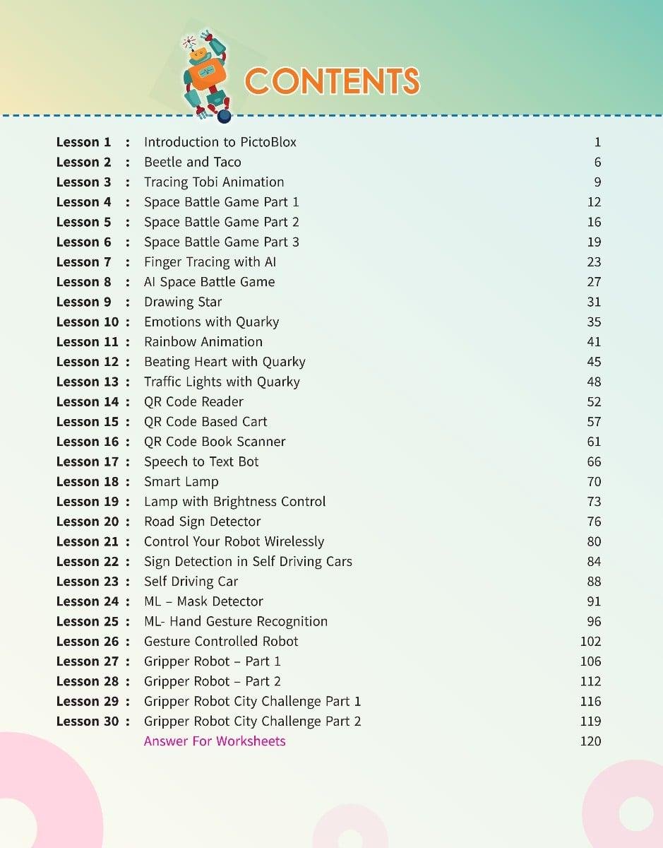 Unlock the power of technology with this Class 5 Coding, AI, and Robotics book, thoughtfully designed to introduce students to core concepts in a fun, hands-on way. With 30 interactive lessons, learners dive into the world of coding, robotics, AI, and machine learning through engaging activities using PictoBlox and Quarky.