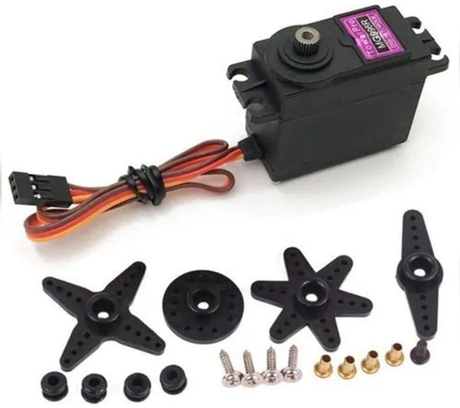 The MG996R High-Torque Digital Servo comes with metal gears, delivering an impressive stalling torque of up to 10 kg in a compact design. This servo is an enhanced version of the popular MG995, featuring improved shock resistance, a redesigned PCB, and a more precise IC control system for greater accuracy.
